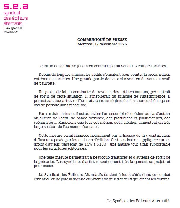 La Ligue salue le soutien du Syndicat des Editeurs Alternatifs à la proposition de loi De Marco relative à la continuité de revenus des artistes-auteurs et autrices.