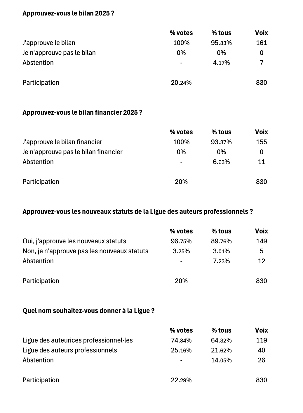 Le bilan financier et moral de l’année 2025 ont été approuvés à la majorité, ainsi que la modification des statuts et le nouveau nom que portera désormais la Ligue : la Ligue des auteurices professionnel·les