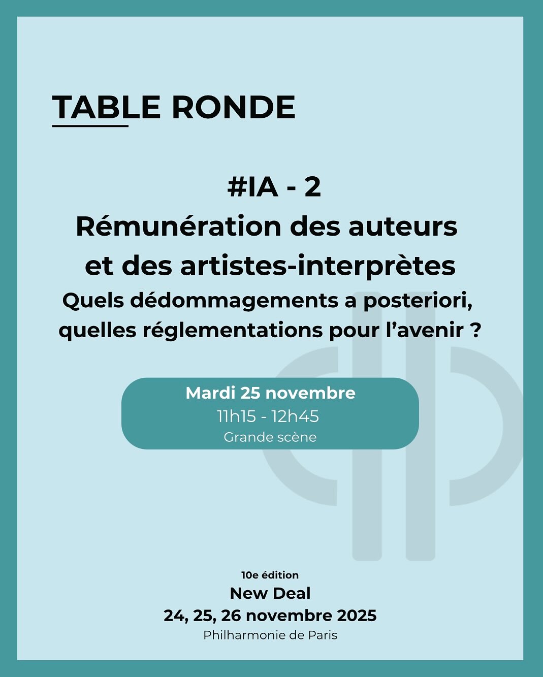 L’essor de l’intelligence artificielle bouscule profondément le cadre juridique et économique de la création artistique. Le mardi 25 novembre, cette table ronde a abordé les enjeux liés à la reconnaissance du statut d’auteur face aux œuvres générées ou co-produites par des IA, à la protection des interprètes, ainsi que ses impacts sur les métiers du secteur musical et du spectacle vivant, entre nouveaux usages et transformations des compétences.